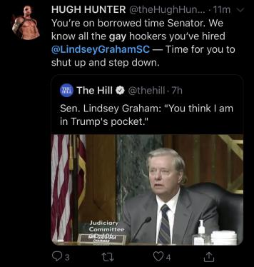 When you pile on as much hypocrisy as Lindsey Graham does I loose my sympathy for him being outed. That’s one southern bitch who has earned getting her panties in a wad.