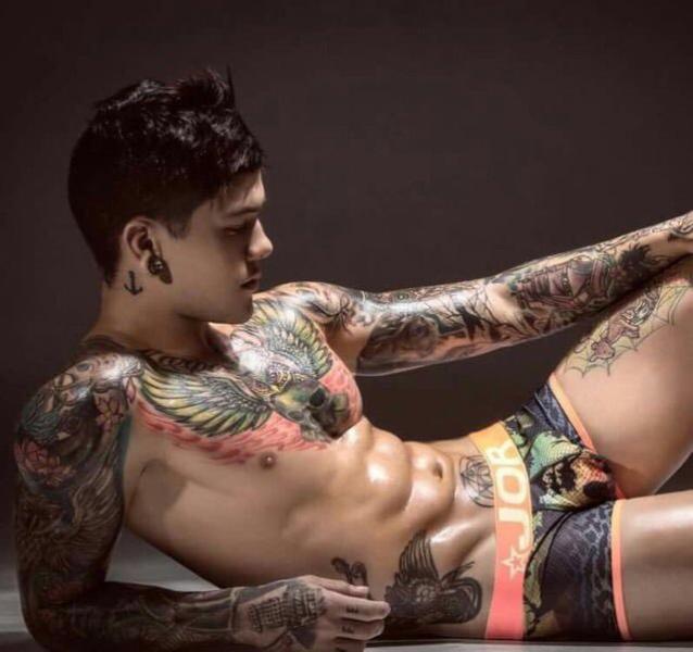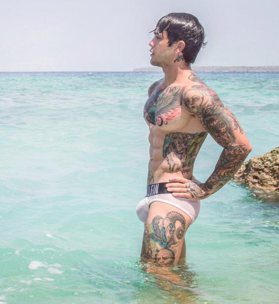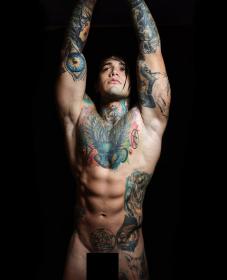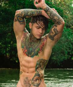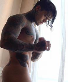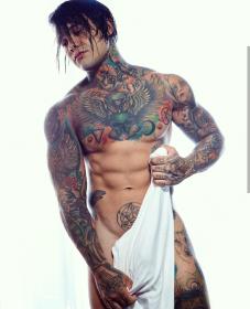 I'm not a huge fan of excessive tats on one body, but this guy's tats are absolutely stunning to me...and his body is exactly the type which drives me bonkers. I have not found any totally nude pics and would LOVE to see what he is packing under his trunks.