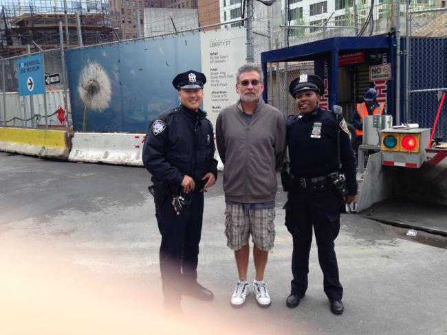 Here are pics from the bridge and the 9-11 site. The final pic is Peter and two NYC cops. They were taking pictures with other tourists and said to the ones in front of us that they were the last ones, but Peter said please one more, and the woman cop say, "Oh your so handsome" and took a pic with Peter. He was glowing from the compliment all day!