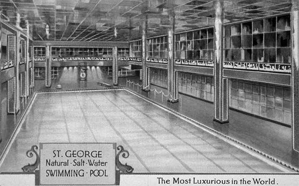 Comprised of eight buildings constructed between 1885 and 1930, the St. George was for a time the largest hotel in New York City. According to historian George Chauncey, it was one of the few upscale hotels in the city that “earned a reputation for their willingness to accommodate gay men on a short- or long-term basis.” In the 1920s, both poet Hart Crane and his lover Samuel Loveman resided there for brief periods. Crane also included a sexual encounter in the men’s room of the Clark Street subway station beneath the hotel in “The Tunnel,” section of his long poem The Bridge. In the 1930s, Brooklyn College teacher David McKelvy White began a year-long courtship of a student, the future beat poet Harold Norse, taking him for dinner in the St. George’s restaurant and for swims in the hotel’s opulent salt-water pool, which historian Hugh Ryan has described as “perhaps the most elegant cruising ground in all of Brooklyn’s history.”