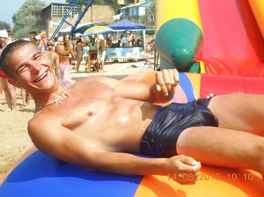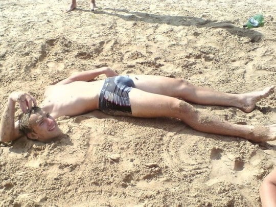 Re post # 4774: I realize that the focus of this pic is on the buried head and the buried body, but I cannot help but focus on the bulging hard cock in those swim trunks!