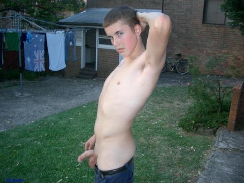 Shirtless Brit boy, jeans down and flashing hardening cock in his back yard waiting for his clothes on the line to dry!