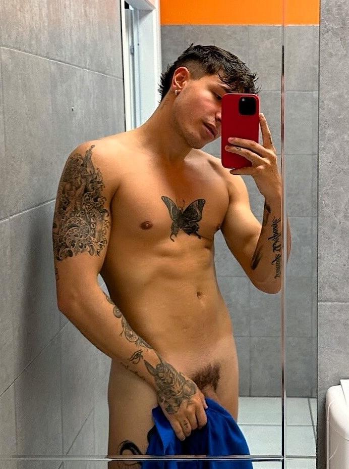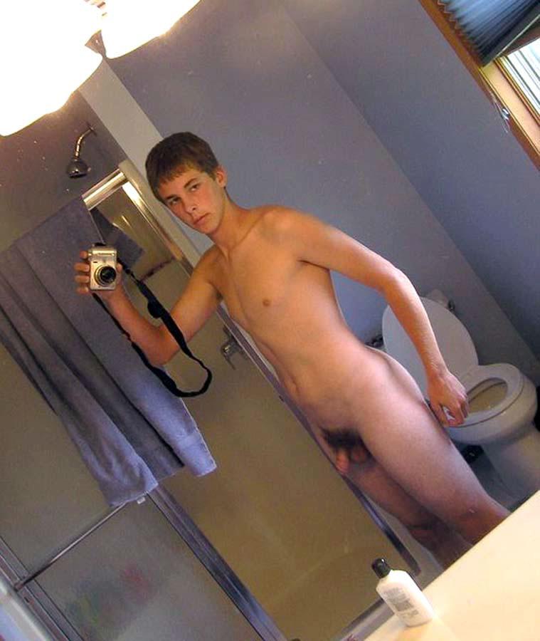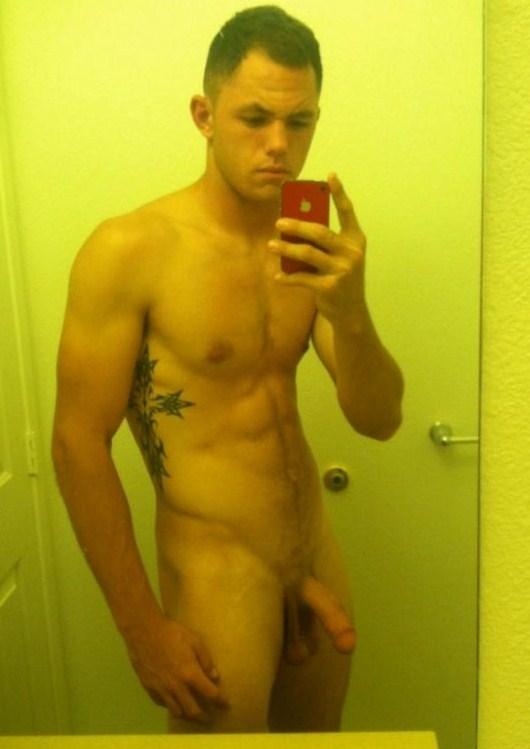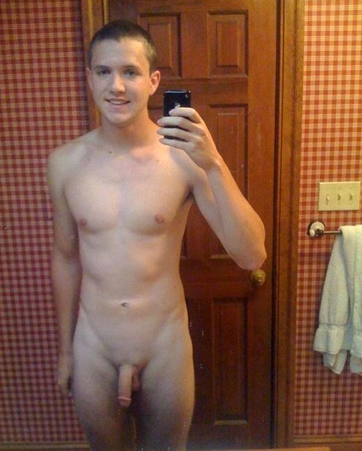 Good looking naked boy, who should not take a selfie of that tiny limp dick!
