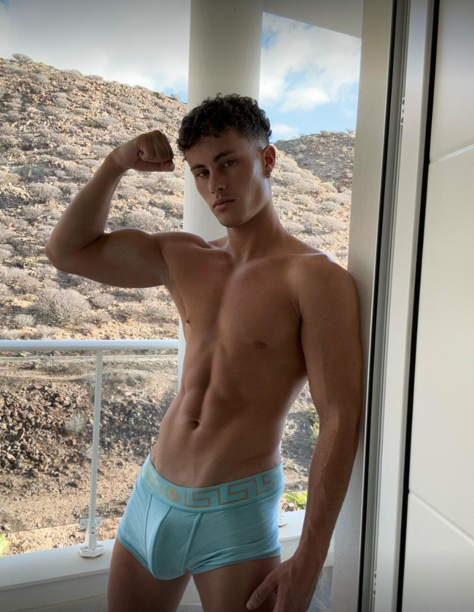 Shirtless flexing young man with hard cock in his light blue briefs!