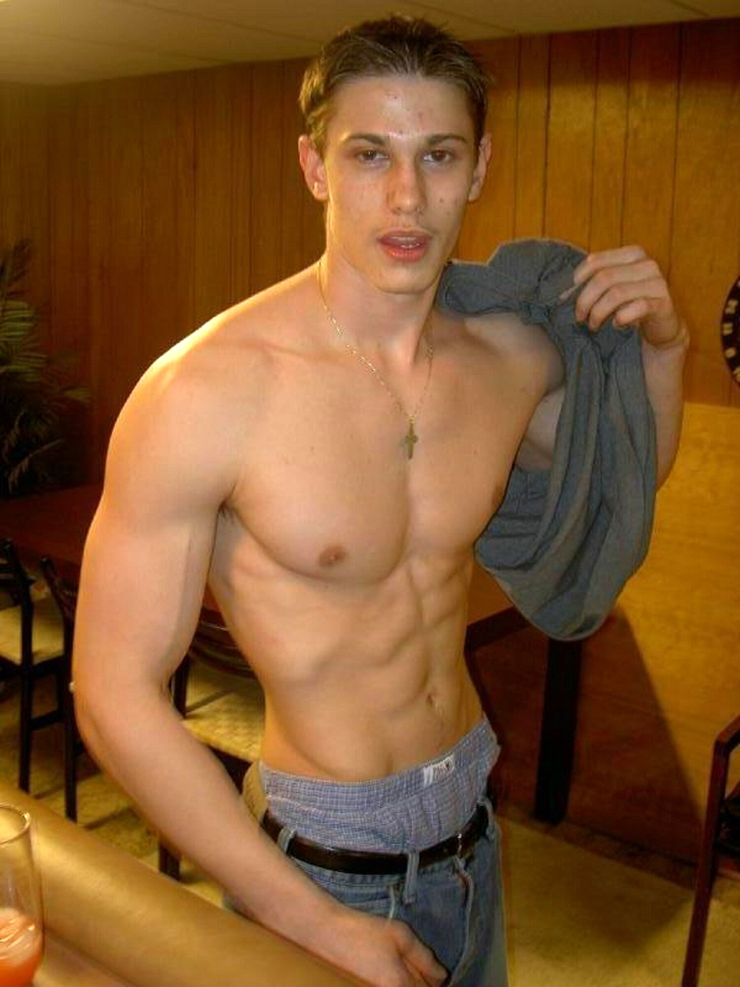 Hot shirtless dude showing a lot of his undies above his jeans!