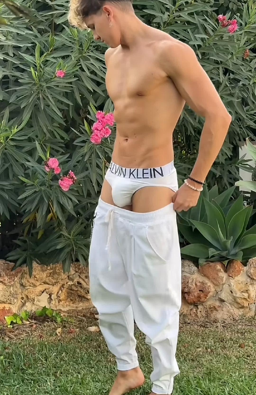 Hot shirtless slender boy flashing his upper pubes and showing off his boner in his white briefs!