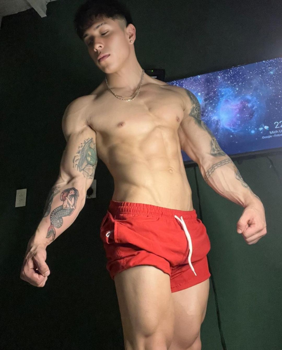 Shirtless young dude bulging!