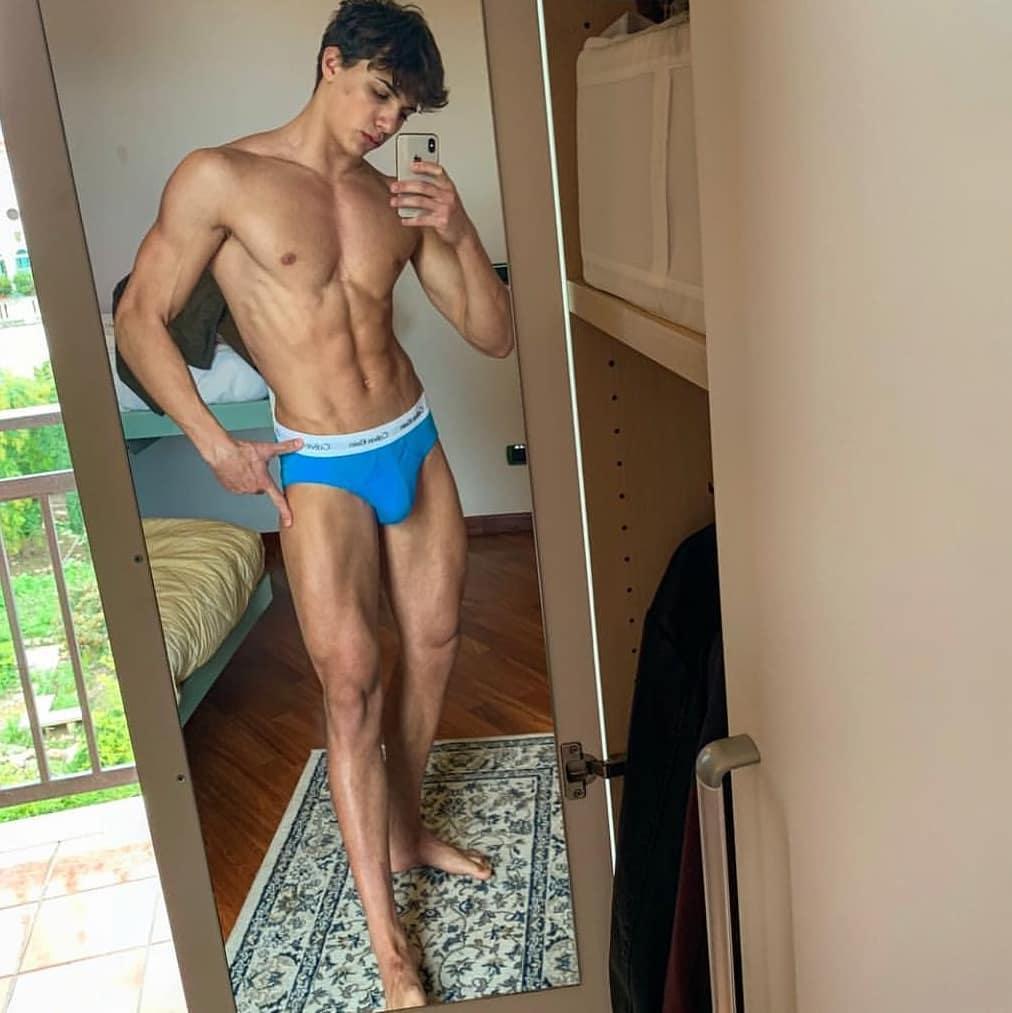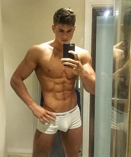 Hot shirtless boy taking selfie of his big bulge in his Calvins!