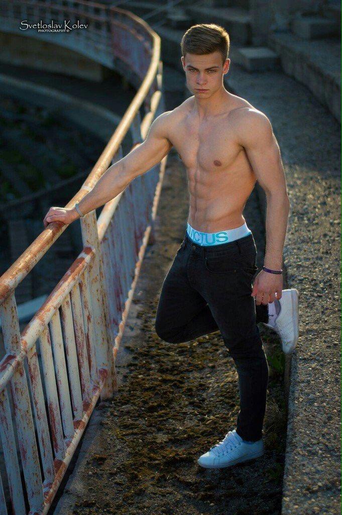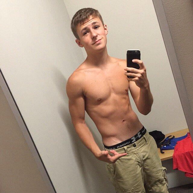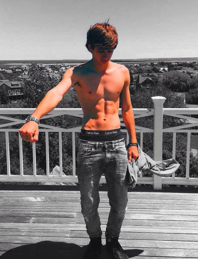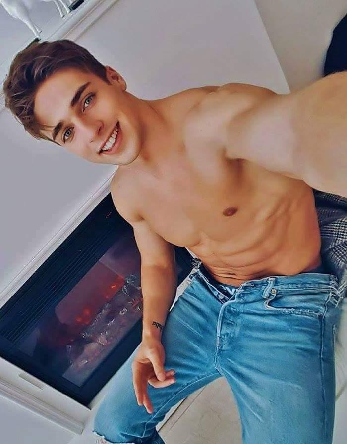 Smiling shirtless boy with jeans unbuttoned at the top!