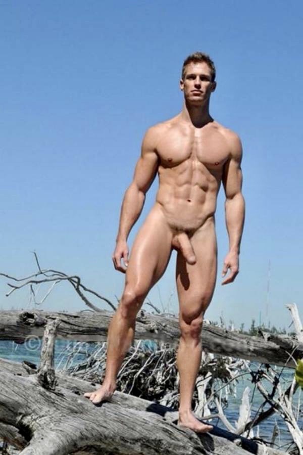 Nude dude standing on a fallen treee limb by the sea!