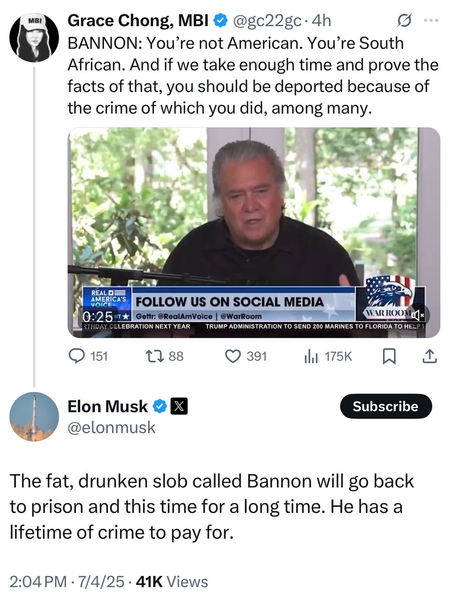 Likewise, Bannon has a long history of underhanded and fraudulent behaviors. That "build the wall" scam he participated in with a few others is an excellent example. They solicited funds to construct a section of border fencing in Texas. They raised money doing so and made assertions about their compensation and what percentage of the money raised would go toward the actual construction of the fencing. Then they used a significant portion of the money raised for their separate personal needs. There are also his various activities with a certain Chinese, anti-communist, billionaire, where some sort of financial activities were being engaged in, though it is not at all clear what all it entailed. But it does take serious cash to go to Italy, rent a large country estate, and run your own personal school for fascists. Elon is correct to say that Bannon needs to go to prison for a very long time.