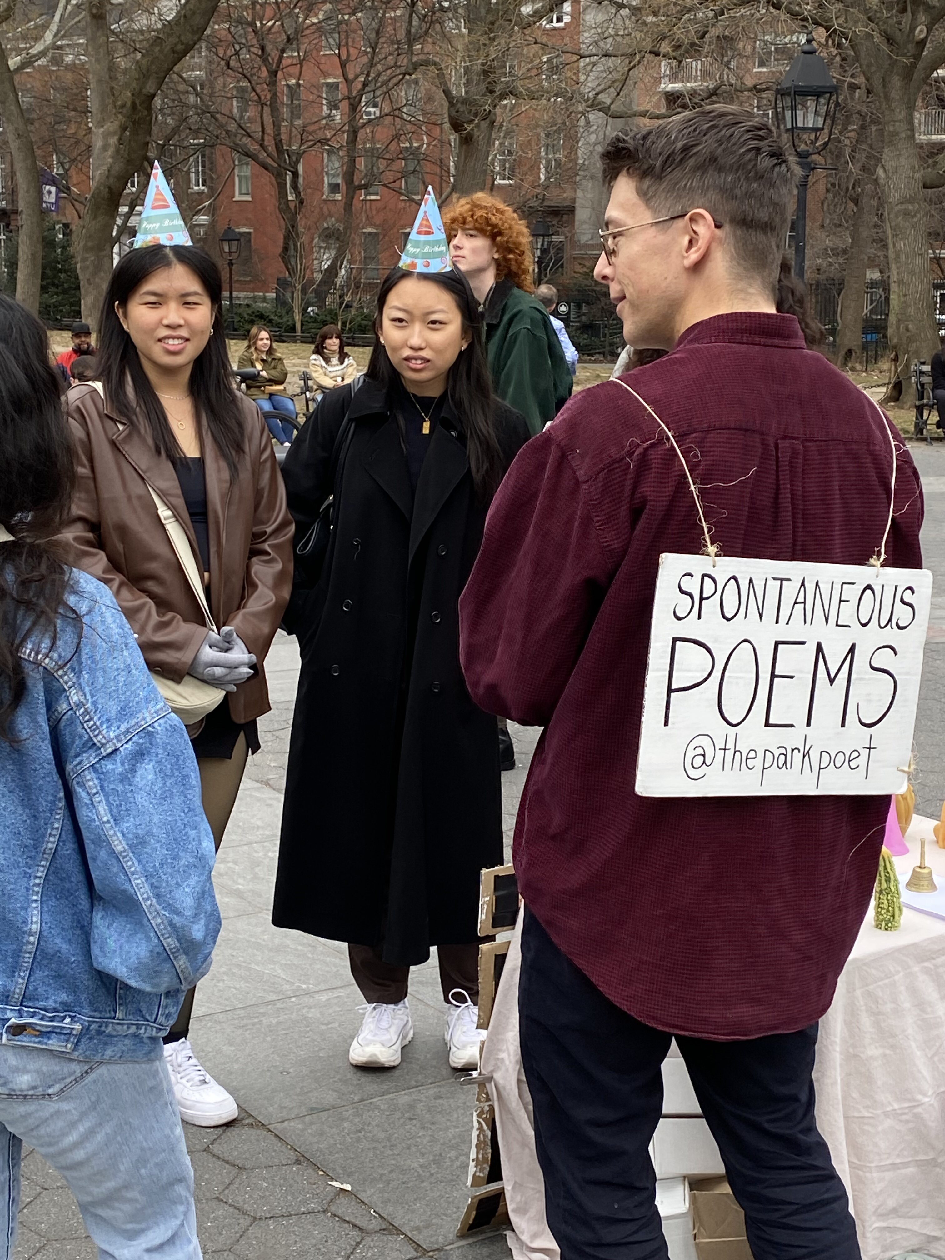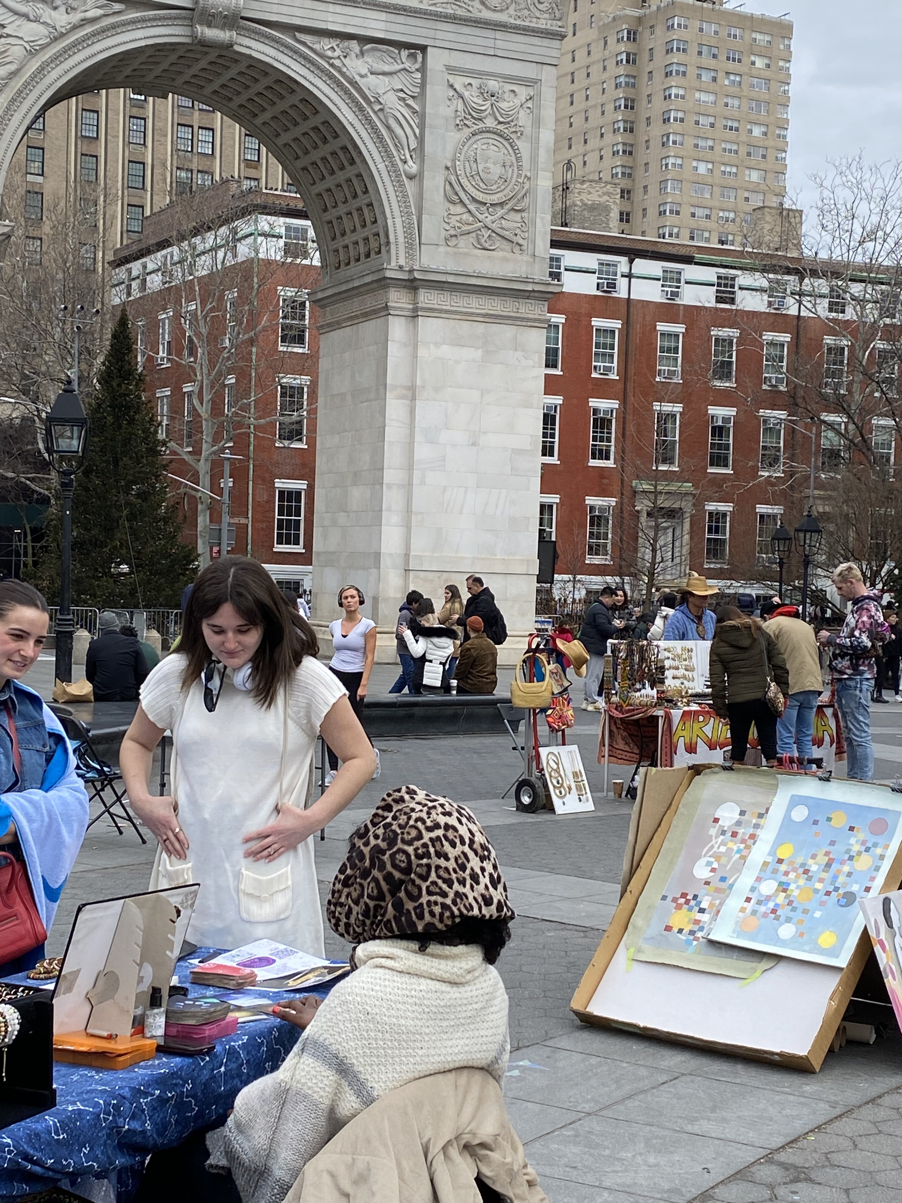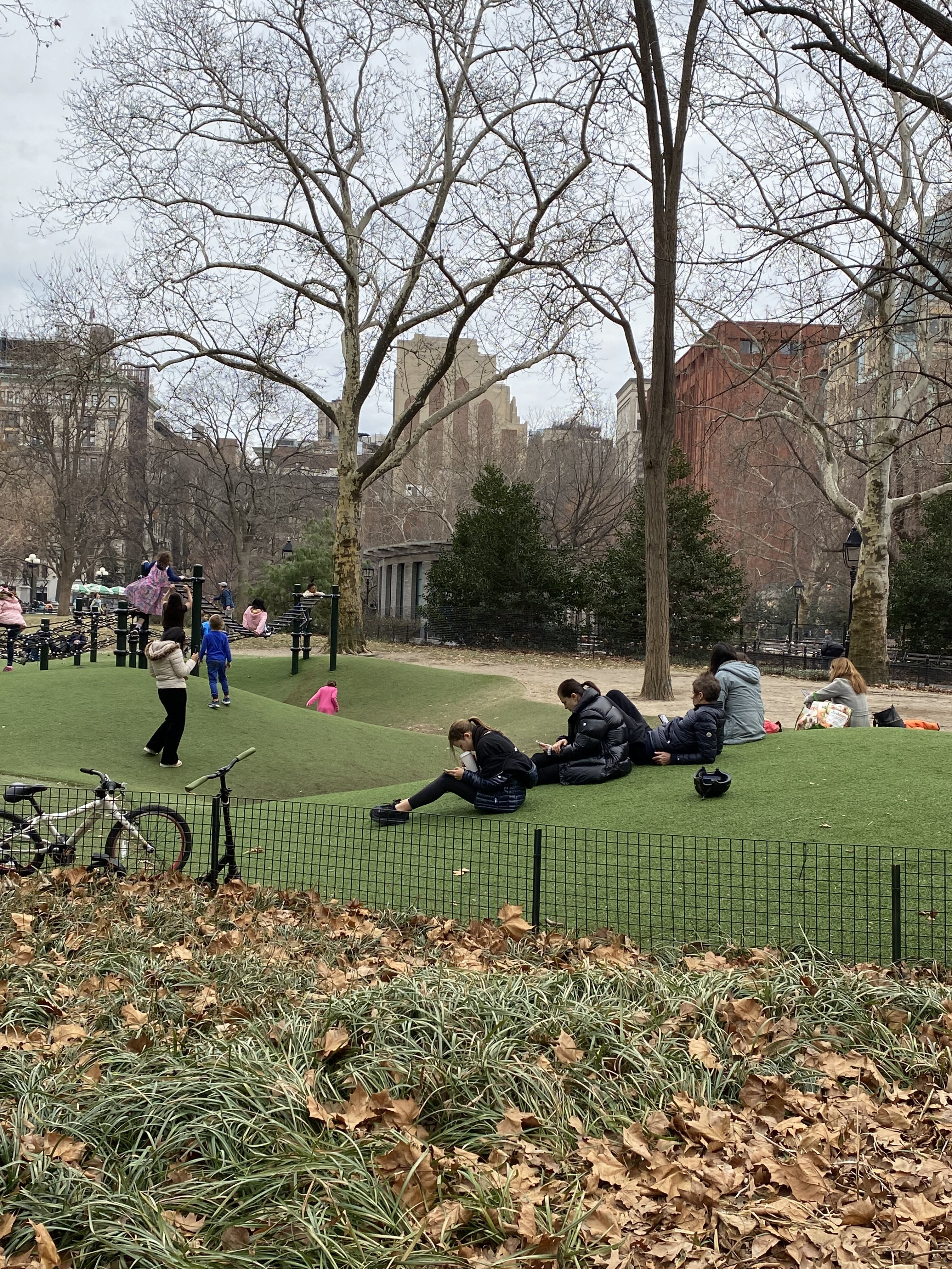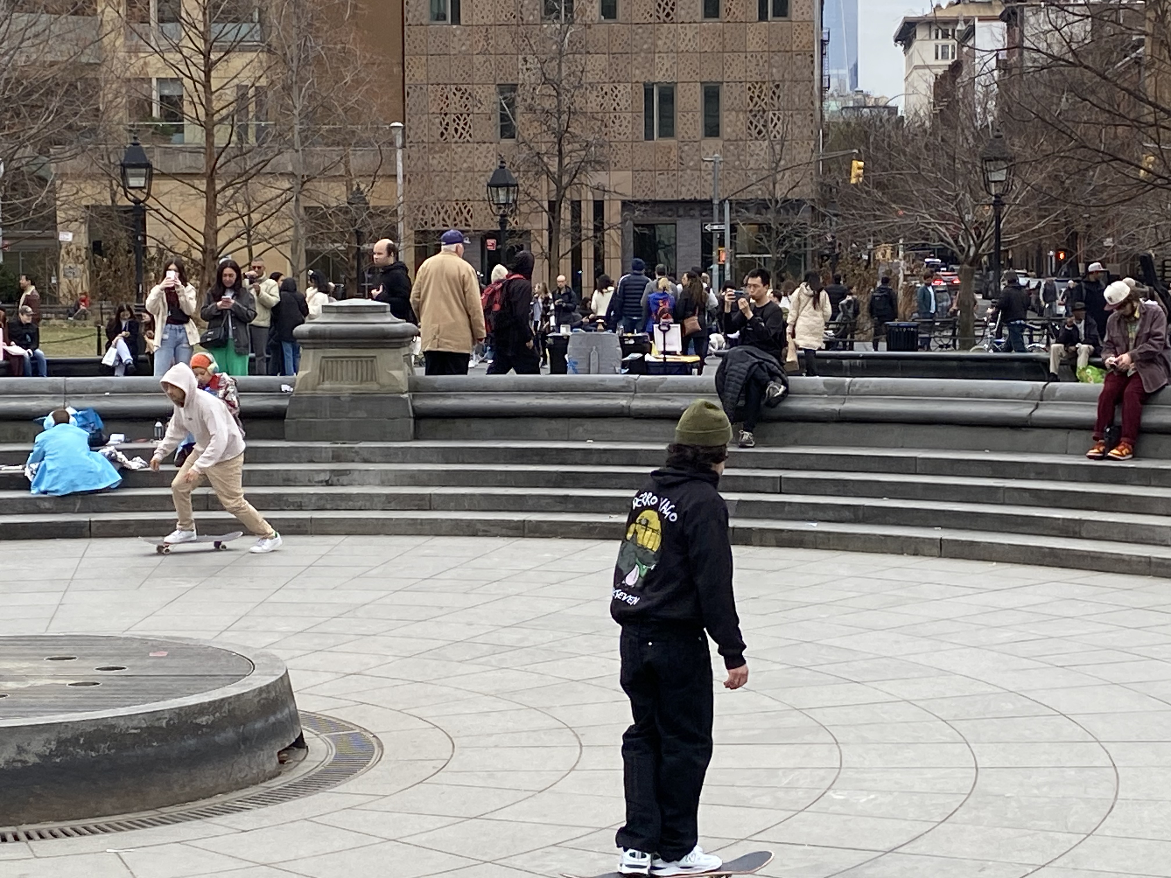 I was in Washington Square Park in Greenwich Village today. For one thing I was thinking about how it has much the same vibe as it did when I was a teenager in the mid to late 1960’s, with singers and poetry and just people hanging out. On a January 2, with the temperature in the low 50’s, it felt more like a spring day, minus the trees and flowers. The fountain had no water in it and was being used as a skateboarding rink.